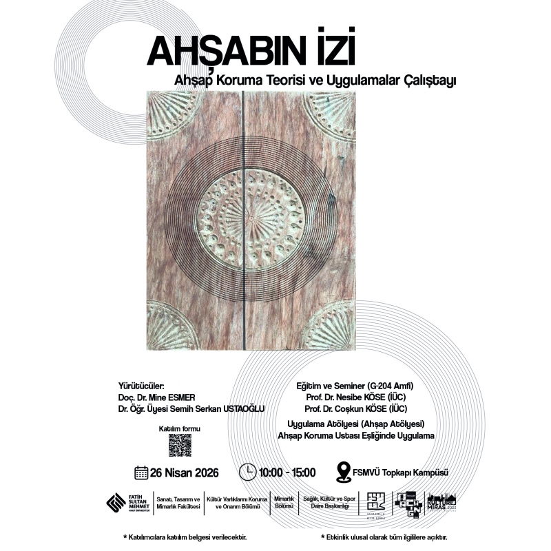 FSMVÜ Sanat, Tasarım ve Mimarlık Fakültesi Mimarlık Bölümü, Kültür Varlıklarını Koruma ve Onarım Bölümü, Arching Kulübü, Kültürel Miras Kulübü ve Mimarlık Kulübü işbirliği ile “Ahşabın İzi – Ahşap Korumada Teori ve Uygulamalar Çalıştayı” 26 Nisan 2025 Cumartesi günü 10:00 – 15:00 saatleri arasında Topkapı Kampüsünde gerçekleştirilecektir. Çalıştay Doç. Dr. Mine ESMER ve Dr. Öğr. Üyesi Semih Serkan USTAOĞLU yürütücülüğünde yapılacaktır. Çalıştayda İstanbul Üniversitesi –Cerrahpaşa Orman Fakültesi öğretim üyeleri Prof. Dr. Nesibe KÖSE ve Prof. Dr. Coşkun KÖSE ahşap tarihlendirme, ahşapta bozunma ve ahşap koruma yöntemleri konusunda TG- 204 numaralı amfide seminer gerçekleştireceklerdir. Seminerin devamında H Blok bodrum katında yer alan ahşap atölyesinde ahşap ustası ile koruma uygulamaları atölyesi yapılacaktır.