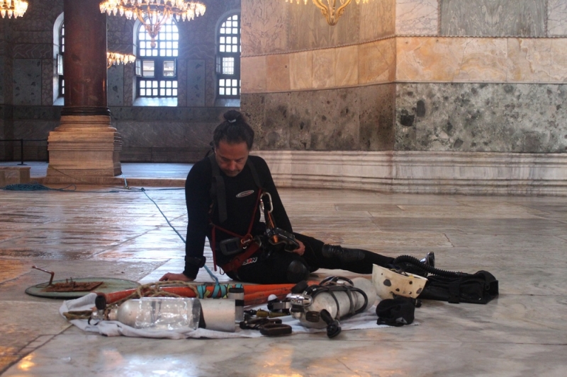 Projenin yürütücülerinden Doç. Dr. Hasan Fırat Diker çalışmalara dair önemli bilgiler paylaştı. Çalışmanın amacının Ayasofya’nın zemin altında kalan havalandırma menfezleri, mezarlar, kuyular ve diğer yeraltı yapılarını anlamaya ve belgelendirmeye yönelik olduğunu söyleyen Diker, “İklimlendirme, zemin suyunu kontrol etme, yağmur suyunu tahliye etme ve su tesisatı gibi ihtiyaçları gidermek için yapılmış bu mekânlar, erişilebildikleri nispette üç boyutlu olarak taranıp belgelendirilmiştir. İçi dolu su kuyularına da uzman dalgıç marifetiyle inilerek, su altı fotoğrafları çekilmiştir. Çalışma kapsamında Ayasofya iç narteksi altındaki büyük mekân ile bu mekânın kuzey ve güney ucundan farklı yönlere devam eden tüneller taranmıştır. Toplam 668 metre uzunluğundaki yeraltı yapısı dijital taramayla, 268 metre uzunluğundaki yeraltı yapısı da geleneksel yöntemlerle el ile ölçülmüştür.” ifadelerini kullandı.