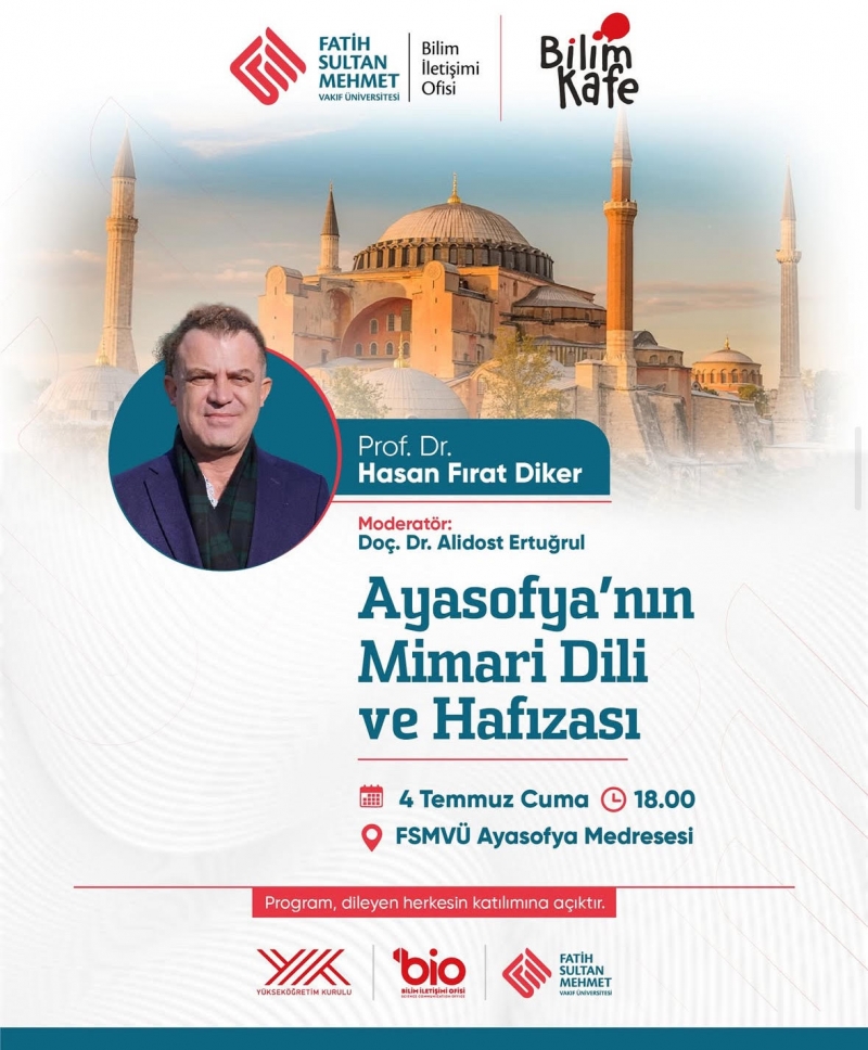 FSMVÜ Bilim İletişimi Ofisi tarafından düzenlenen Bilim Kafe Etkinlikleri kapsamında, moderatörlüğünü Doç. Dr. Alidost Ertuğrul'un yaptığı, Üniversitemiz Sanat, Tasarım ve Mimarlık Fakültesi Mimarlık Bölümü öğretim üyesi Prof. Dr. Hasan Fırat Diker'in konuşmacı olarak yer aldığı programda, Ayasofya'nın mimari dili ve toplumsal hafızadaki yeri ele alınmıştır.