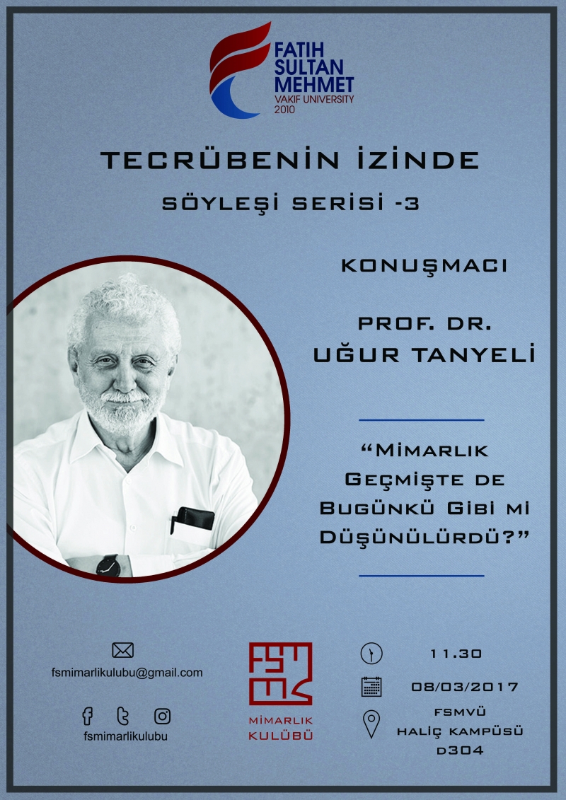 FSMVÜ Mimarlık Kulübü'nün düzenlediği "Tecrübenin İzinde" söyleşilerinin üçüncüsü 8 Mart 2017 Çarşamba günü Prof. Dr. Uğur Tanyeli ile gerçekleşti. "Mimarlık Geçmişte de Bu Günkü Gibi mi Düşünülürdü ? " başlıklı sunum katılımcılar tarafından yoğun ilgi gördü.
